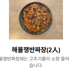 | 해물쟁반짜장(2인) | 24,000원 | 쫄깃한 면발+짭조름한 해물 짜장 |