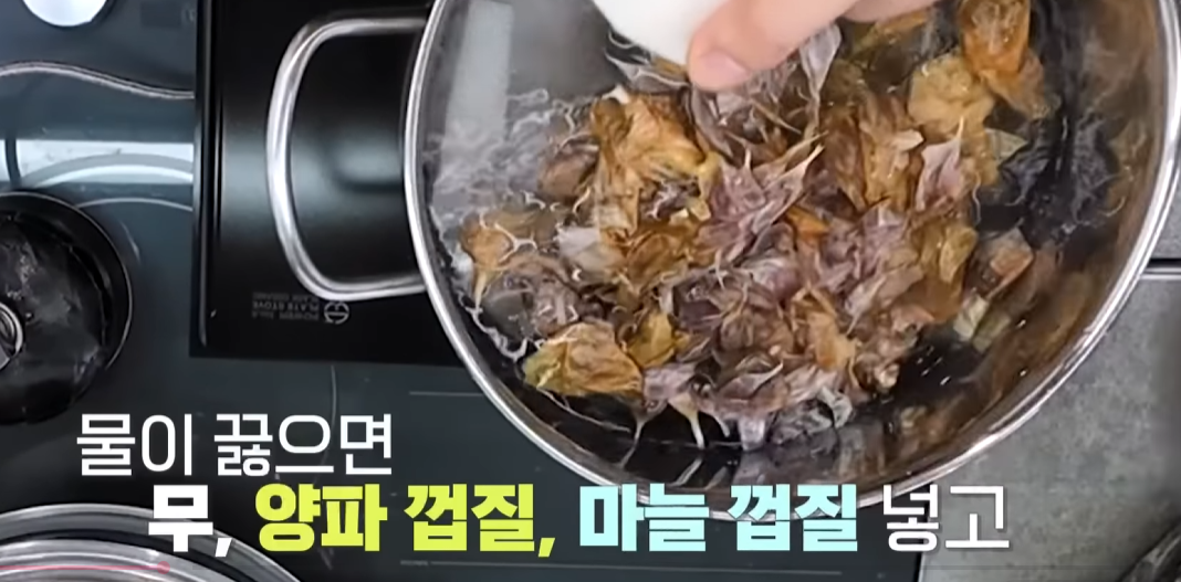 - 말린 양파 껍질, 마늘 껍질, 파뿌리, 멸치, 디포리, 건고추, 늙은 호박, 생찹쌀을 한 번에 넣습니다.