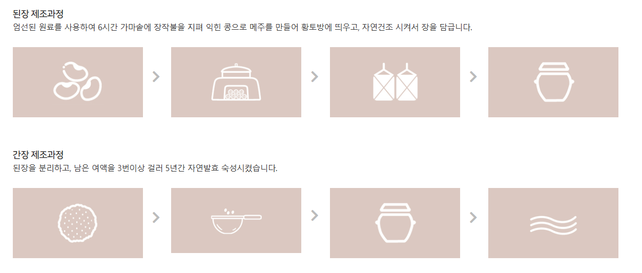 - 된장, 청국장, 고추장, 그리고 두부장을 포함한 여러 제품은 천일염 + 국산 콩을 사용하며, 첨가물 없이 자연 숙성으로 깊고 구수한 맛을 냅니다.