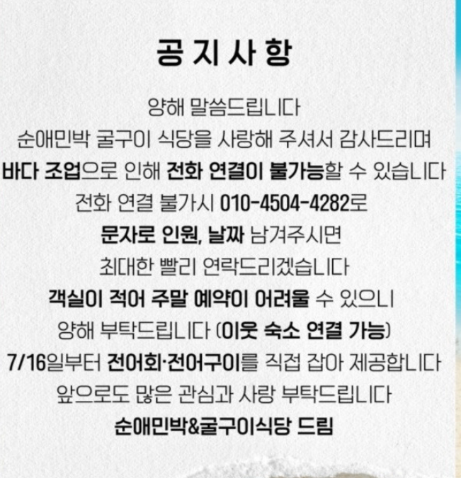 방송 이후 포털 실시간 검색어에도 “순애민박굴구이”가 오르며 예약 문의가 폭주하고 있다고 합니다.