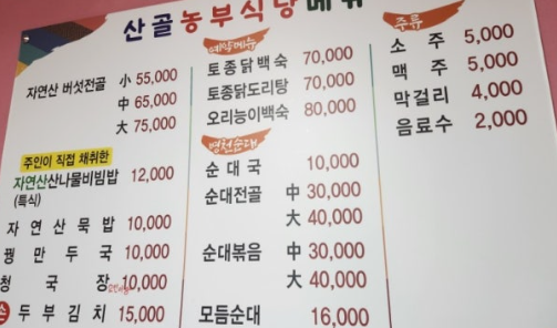 | 자연산 버섯전골 (소/중/대) | 55,000 ~ 75,000원 |